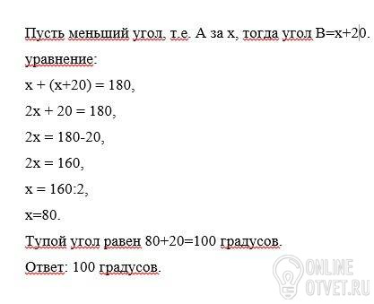 Один из углов параллелограмма на 20 градусов больше другого. Найти тупой угол параллелограмма