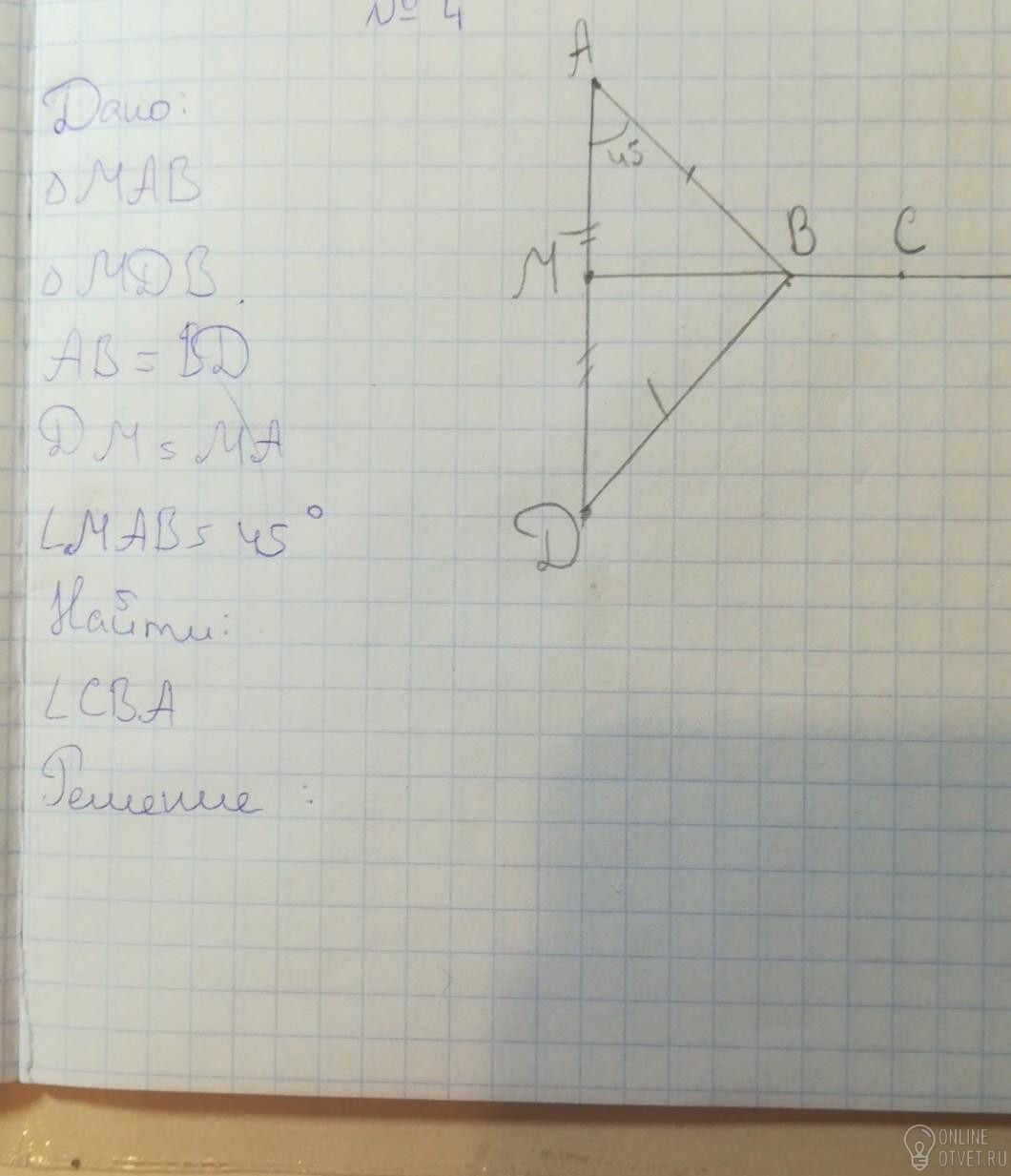 Треугольник ABD равнобедренный по условию угол А равен 45 следовательно угол D равно 45 а В равен 90 градусов mb медиана в равнобедреном треуголинике а значит бисектриса угол абм равен 45 он смежный с углом цба при прямой мц следавательно цба равен 180-45