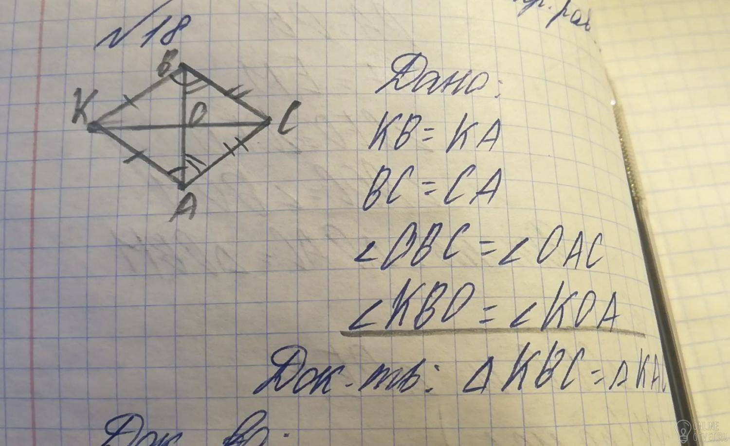 1 рассмотрим треугольник kbc и kac. 2 kb = kc ( по условию ) 3 bc = ac ( по условию ) 4 угол kbo = углу kao. ( по условию ). Следовательно углы равны