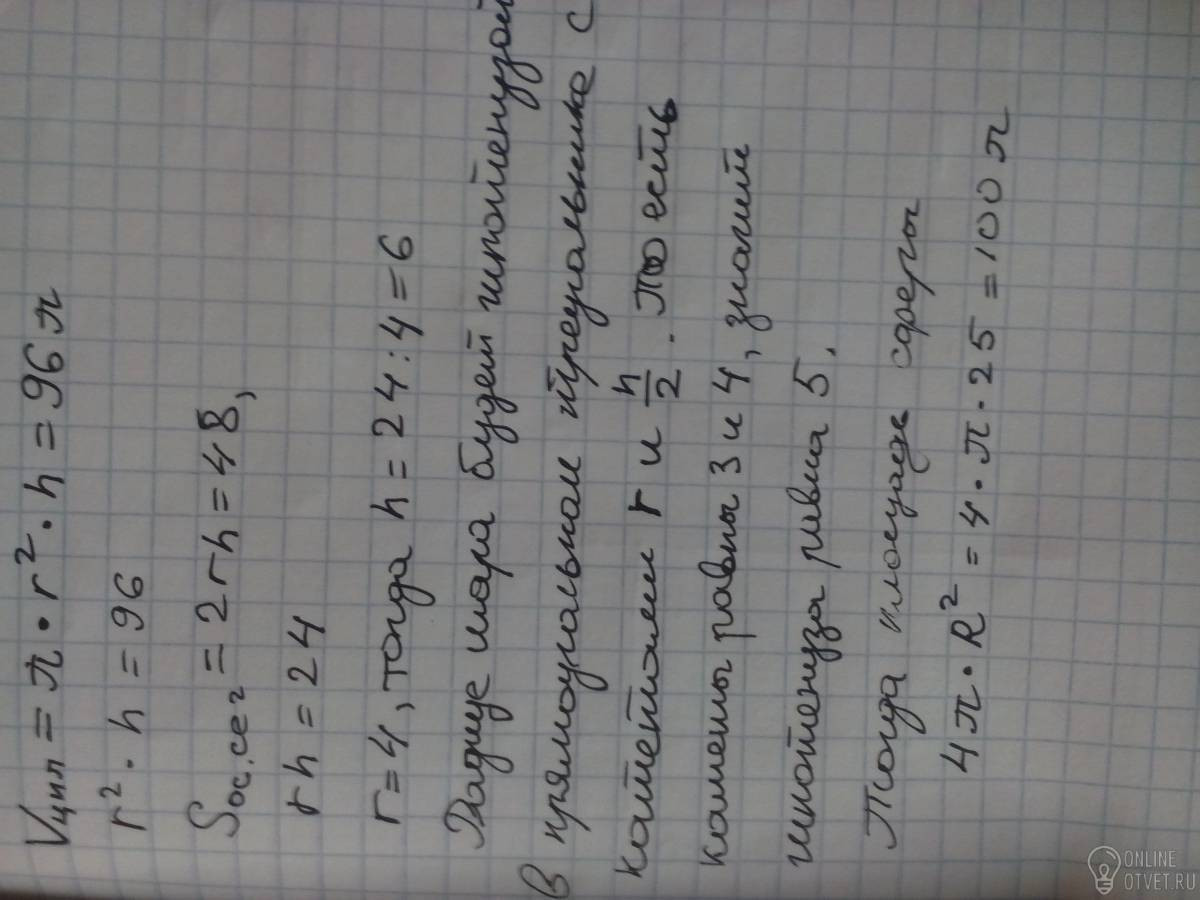 Объем цилиндра 96п см^3, площадь его осевого сечения - 48 см^2 найдите площадь сферы, описанной около цилиндр.