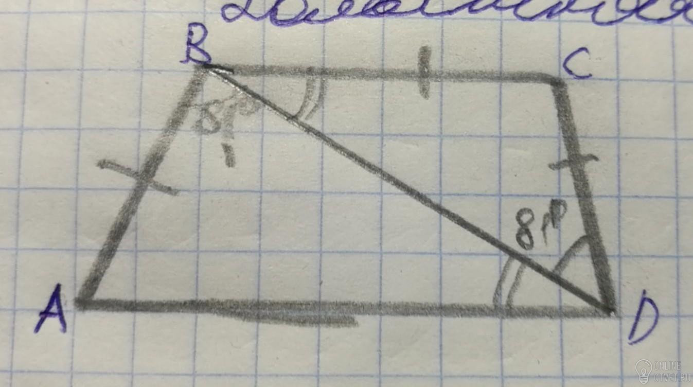 Эта трапеция равнобедренная следовательно углы при основании равны равны.Треугольник BCD равнобедренный т.к у него боковые стороны равны то угол CBD=CDB=81 следовательно углы CBA и CDA равны=162. Угол BCD найдем по св-ву треугольника 180-81-81=18.И найдем BAD 360-18-162-162=18.Ответ:Углы B=D=162,A=C=18.