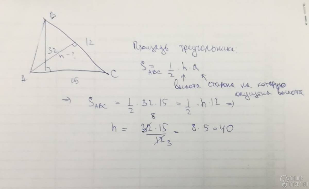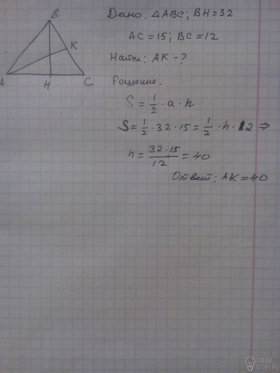 Высота BH △ABC, проведенная к стороне AC, равна 32. Сторона AC равна 15, BC = 12. Найти высоту проведенную к стороне BC