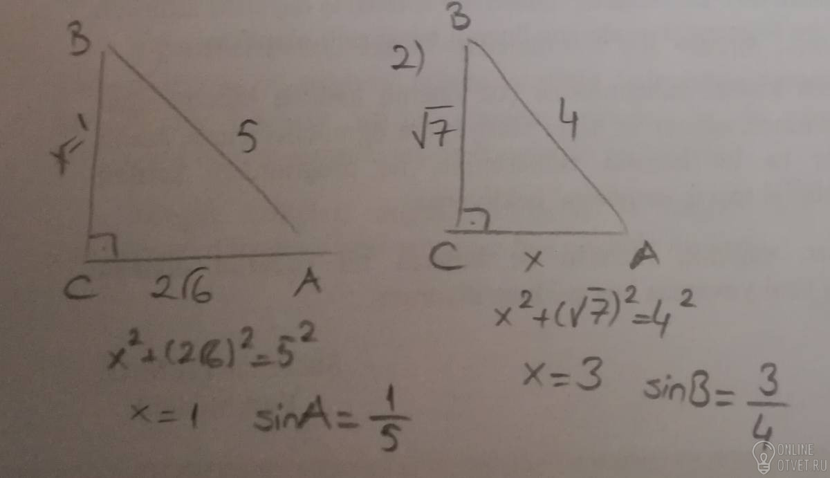 1)в треугольнике АВС угол С равен 90,cos А=2√6/5.найдите sin А.2)В треугольнике ABC угол C равен 90 градусов sin A=корень 7/4 найти sin B