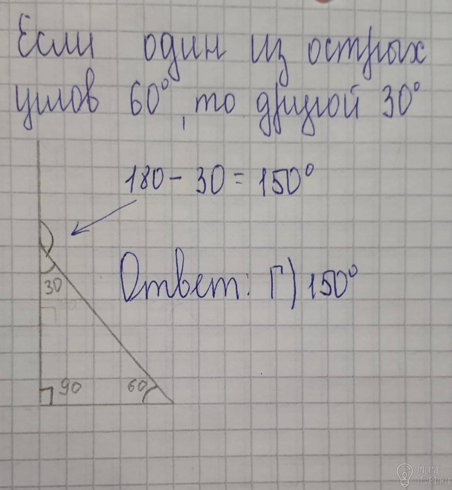 Один из острых углов прямоугольного треугольника в 2 раза меньше второго острого угла. Найдите внешний угол при его вершине. Варианты ответы : А) 30 градусов Б) 60гр В) 120 гр Г)150 гр