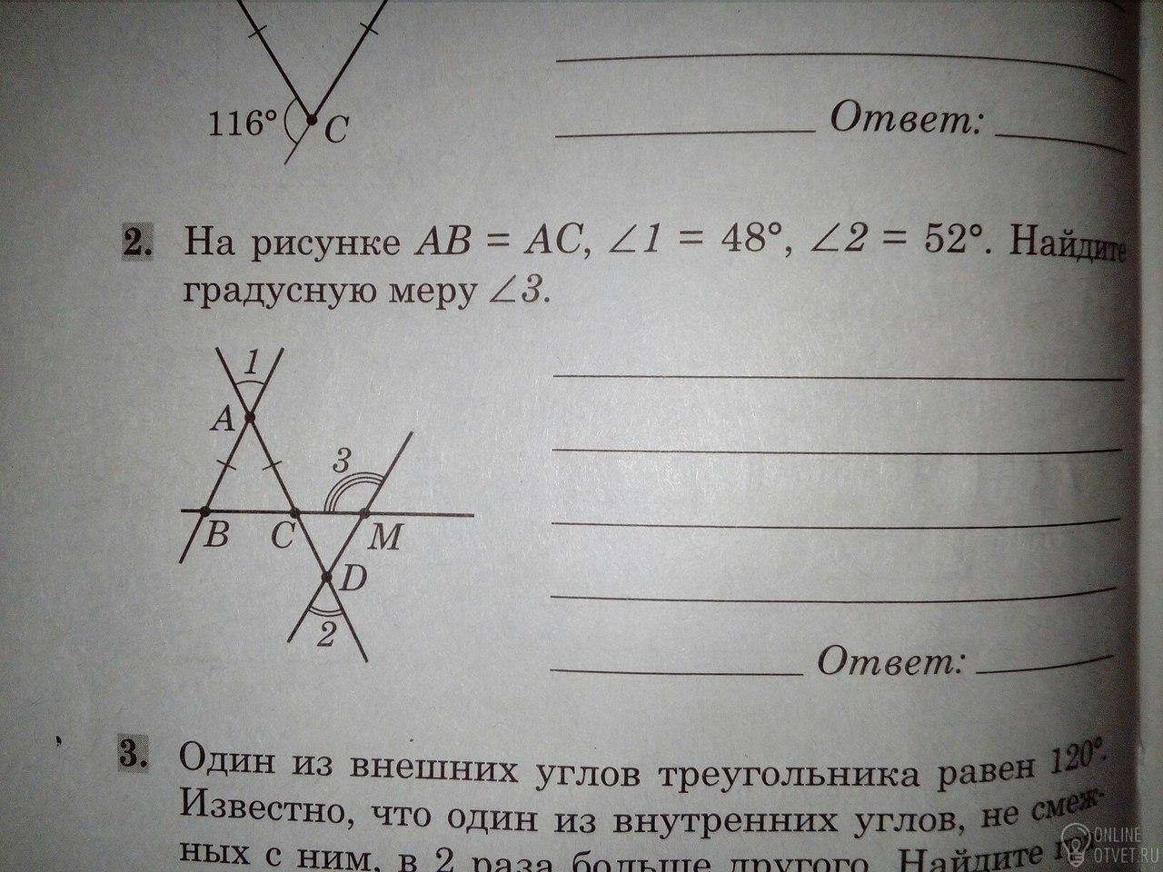 В равнобедренном треугольнике АВС уг ВАС вертикальный и равен углу 1, т.е. 48°