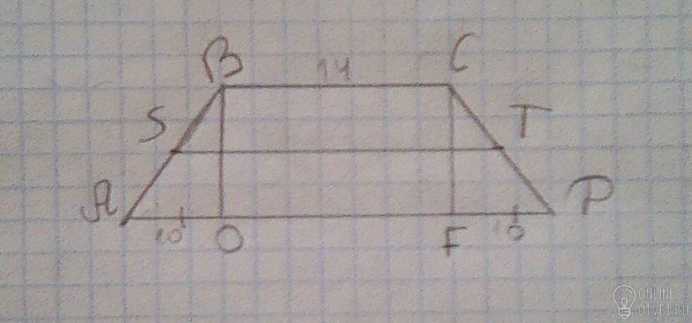 В равнобедренной трапеции высота делит большее основание на отрезки, равные 24 и 10 см. Найти среднюю линию трапеции.
