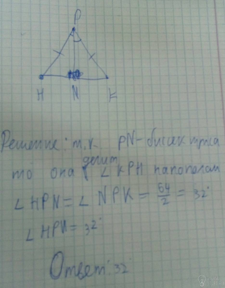 Начертите равнобедренный треугольник HPK с основанием HK и постройте биссектрису PN. найдите угол HPN, если угол KPH =64 °