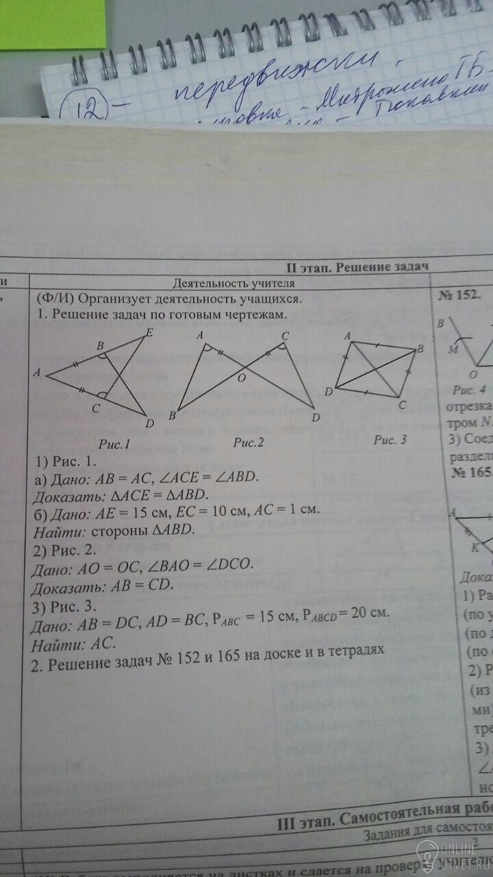 2) Прямые AD и CB пересекаются в точке О. Противолежащие углы при пересечении прямых равны между собой, значит ∠AOB=∠COE. Тогда, по второму признаку равенства треугольников, треугольники AOB=COE.