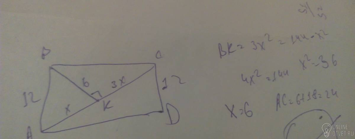 Найдите диагонал АС прямоугольника АВСД, если ВК перпендикулярен АС, СД=12см, а АК и КС относятся как 1:3