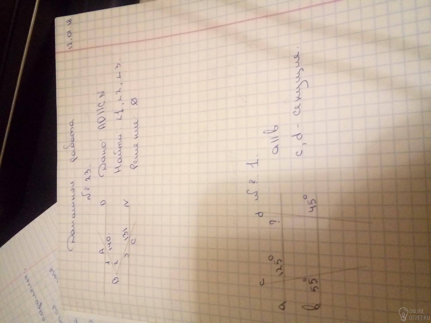 В номере 1 угол равен 135 градусам, т.к. угол справа искомого угла есть соответственный углу в 45 градусов, следовательно, искомый угол равен 180-45=135 градусам. В номере 23 угол 1=40 градусам (т.к. развёрнутый угол есть 180 градусов), угол 3=180-135=45 градусов. Угол 2=разность полудуг, заключенных между двумя его сторонами.