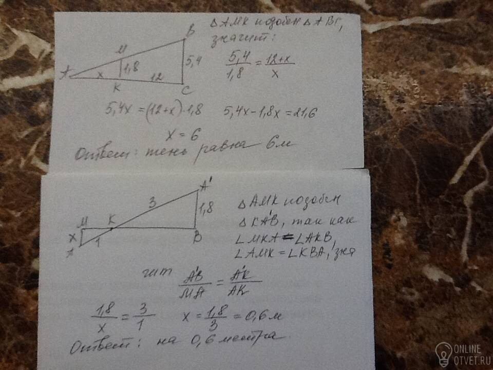 2.Человек ростом 1,8 м стоит на расстоянии 12 м от столба, на котором висит фонарь на высоте 5,4 м. Найдите длину тени человека в метрах.