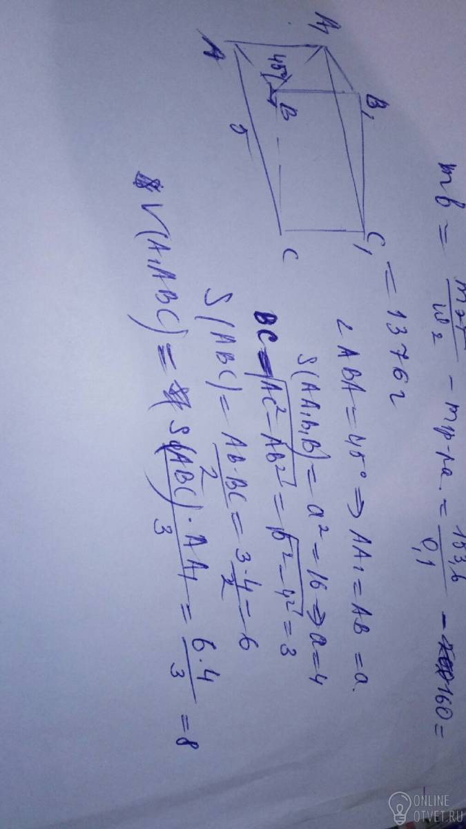 Основание прямой призмы ABCA1B1C1-прямоугольный треугольник ABC,у которого угол CBA=90 градусов,CA=5м.Площадь боковой грани BB1A1A призмы равна 16м^2,а градусная мера двугранного угла A1BCA равно 45 градусов.Вычислите обьем пирамиды A1ABC