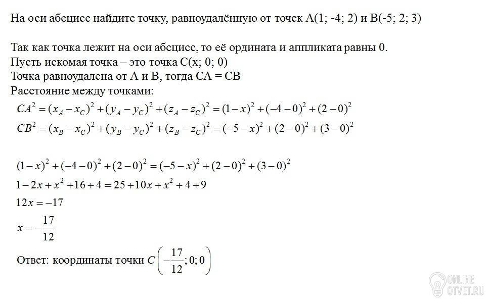 На оси абсцисс найдите точку, равноудаленную от точек А(1;-4;2) и B(-5;2;3)