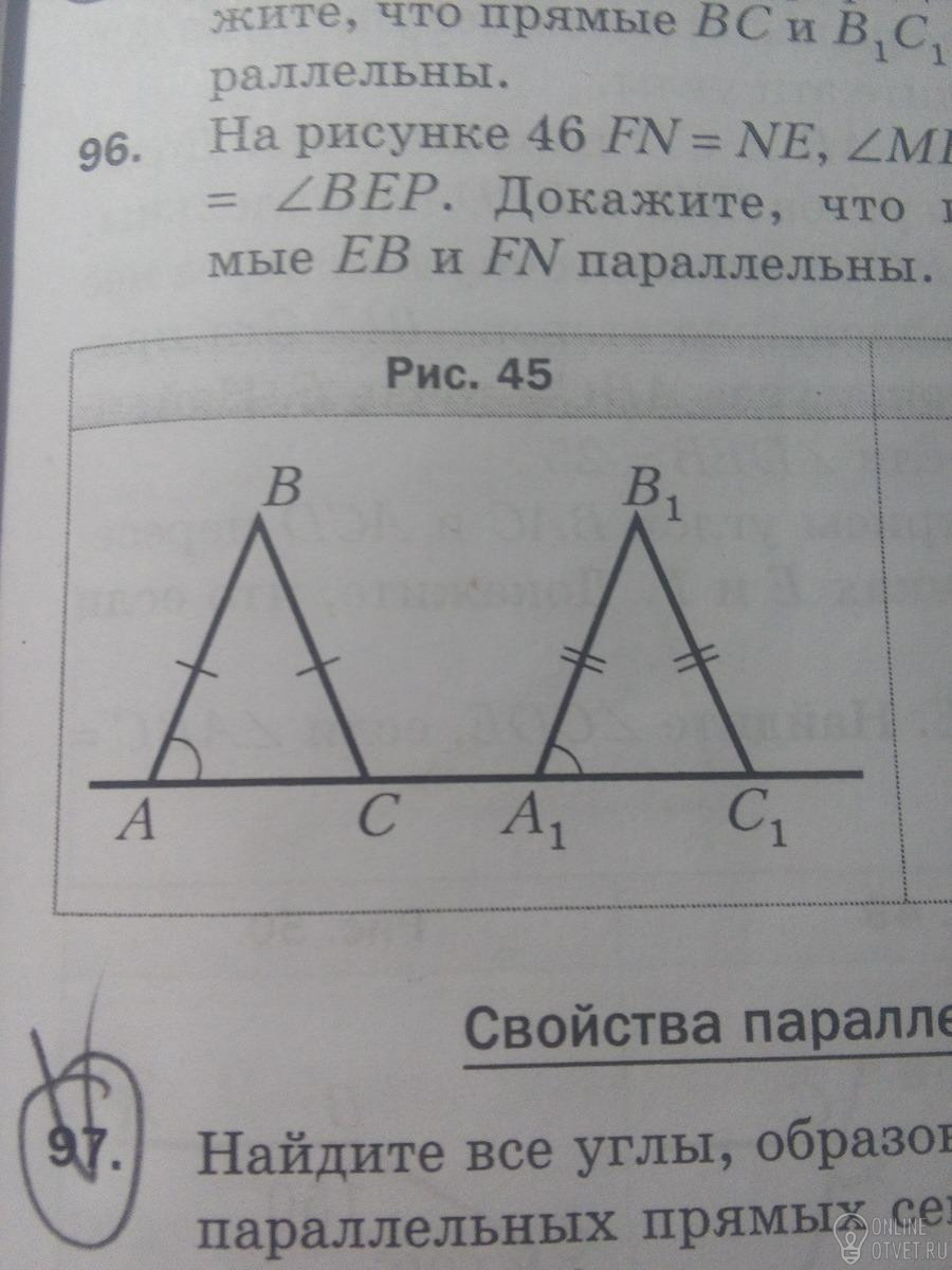 Рассматриваются 2 равнобедренных треугольника:АВС и А1В1С1.У которых углы ВАС и В1А1С1 равны. но у равнобедренных треугольников и углы ВАС=ВСА, и, соответственно, углы В1А1С1=В1С1А1. И, следовательно, углы ВСА=В1С1А1. А раз так, то прямые ВС и В1С1 паралельны.