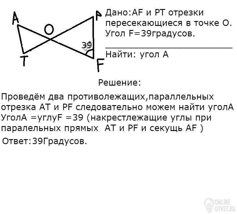 Отрезки АF и рт пересекаются в их середине в точке О. найти угол А если угол F=39 градусов