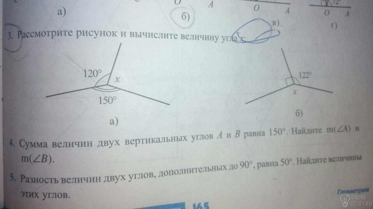 Окружность равна 360 градусам.Здесь 3 угла.2 из них по 120 и 150.Следовательно третий угол х = 360 -120-150= 90.