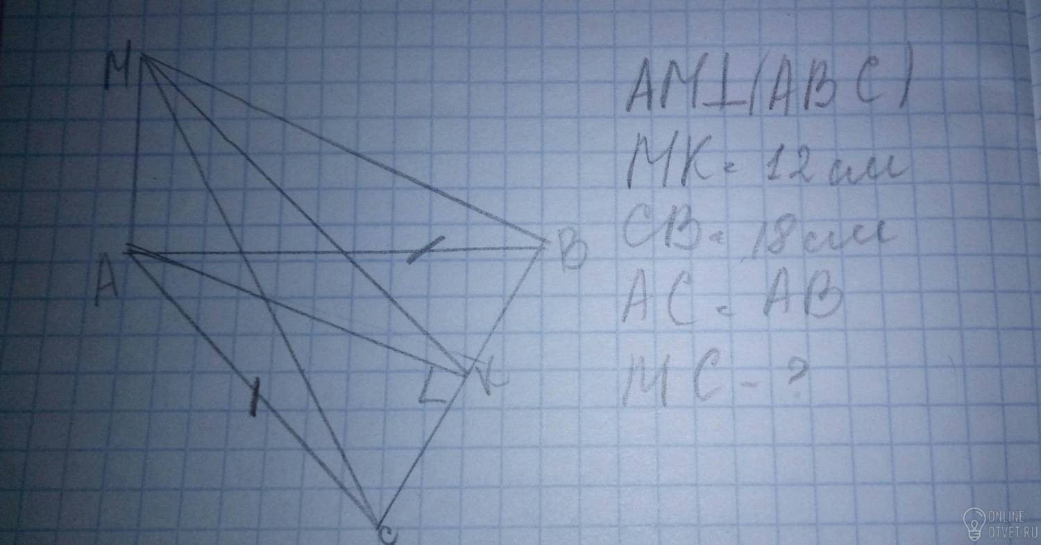 АВ = АС - это равные проекции наклонных МС и МВ на плоскость треугольника АВС. Если проекции равны, то равны и наклонные, поэтому МС = МВ и ΔМВС - равнобедренный.