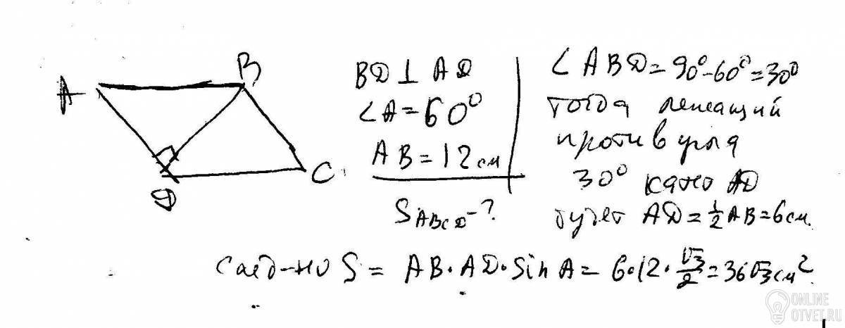 Диагональ ВД параллелограмма АВСД перпендикулярна к стороне АД, АВ= 12 см, угол А=60'С. Найдите площадь параллелограмма?