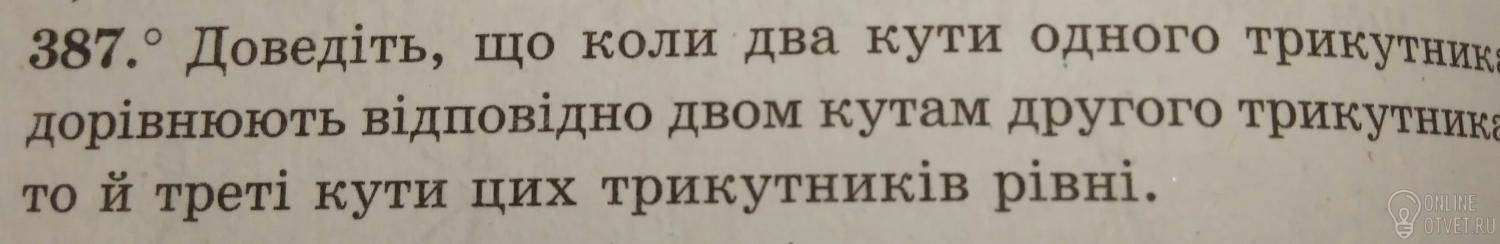 Тут просто: Сума кутів будь-якого трикутника дорівнює 180 градусів, тож якщо два кути однакові, то вони мають однакову суму, отже 180 - (кут 1 + кут 2 ) = кут 3 і цей третій кут одного трикутника дорівнює третьому куту іншого трикутника