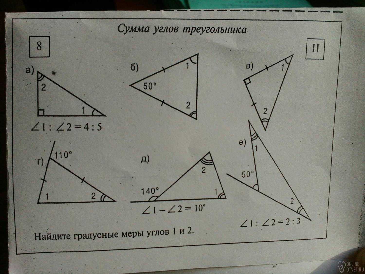 А) В треугольник 180°, 180°-90°=90° (на 2 угла их отношение 4:5, значит ∠1=40° ∠2=50°)