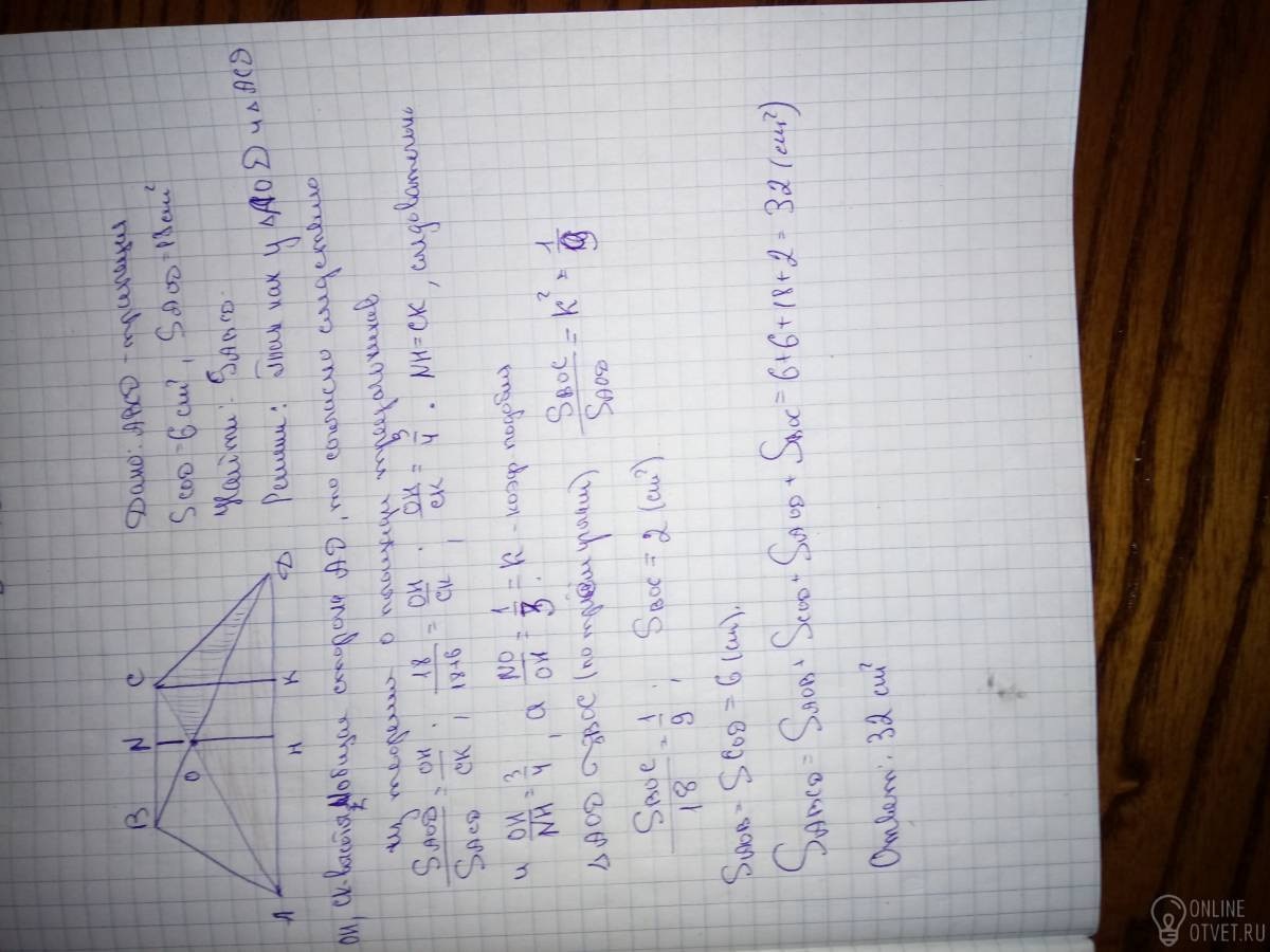 Диагонали трапеции АВСД пересекаются в точке O. Площадь треугольника СОД равна 6 см2, площадь треуголбника АОД равна 18 см2, найдите площадь трапеции.