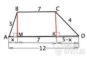 Найти высоту трапеции с основаниями 7 и 12 и боковыми сторонами 3 и 4