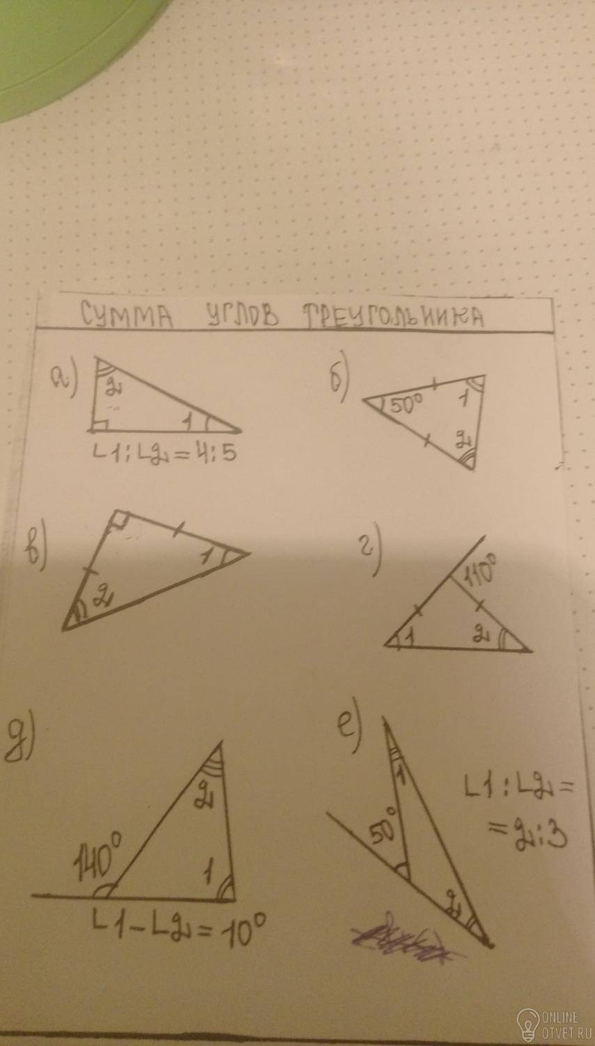 Д)180-140=40 (показано , что угол 1 на 10 больше угла 2) 180-40=140 это угол 1 и 2 вместе . Составляем уравнение х-2угол