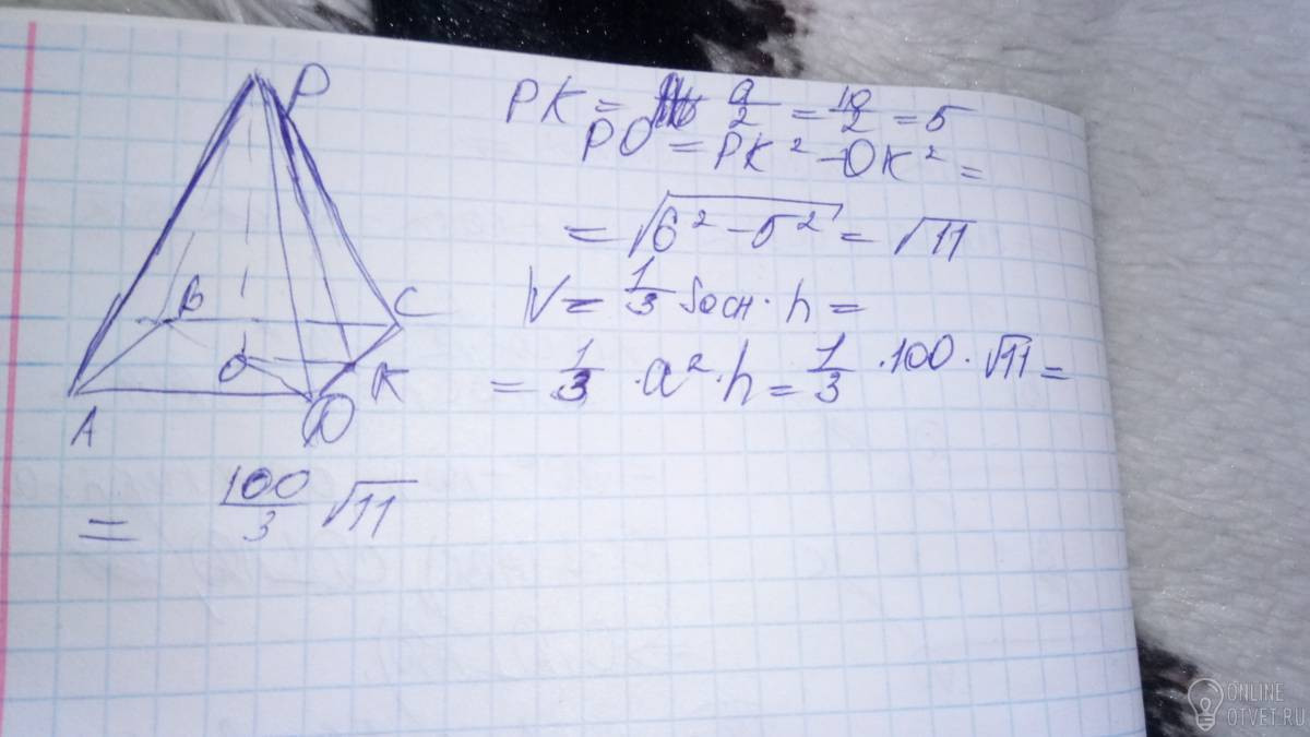 Дано правильную 4кутную пирамиду сторона основт 10см , апофема 6 см. Знайти обєм пирамиди