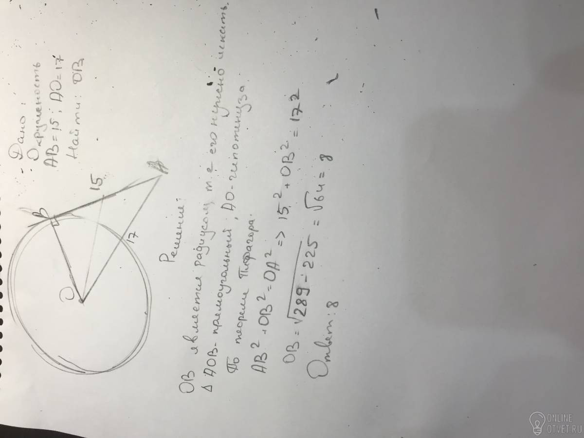 К окружности с центром O проведены касательные AB и секущая AO найдите радиус окружности, если AB = 15 AO = 17 см.
