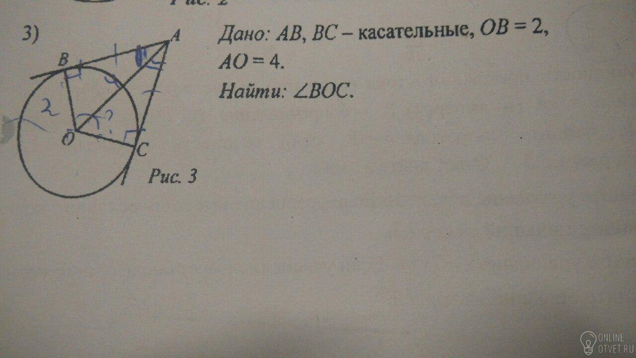 из треуг aob имеем: угол bao = 30 градусов, так как катет bo=1/2ao, следовательно, угол boa=180-90-30=60 град. и угол boc =2углаboa=120 град.