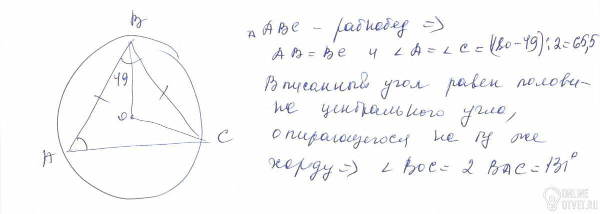 Окружность с центром в точке O описана около равнобедренного треугольника ABC, в котором AB = BC и ∠ABC = 49°. Найдите величину угла BOC. Ответ дайте в градусах.