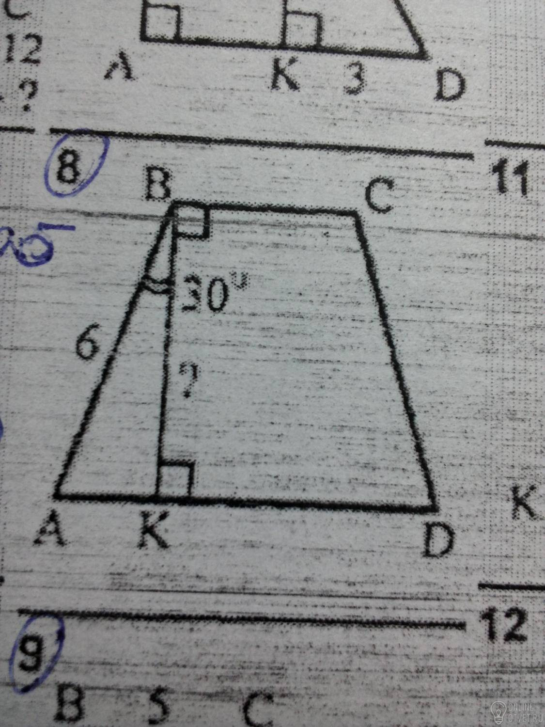8)катет против 30=половине гипотенузы=3, по пифагору из абк находим бк=√27