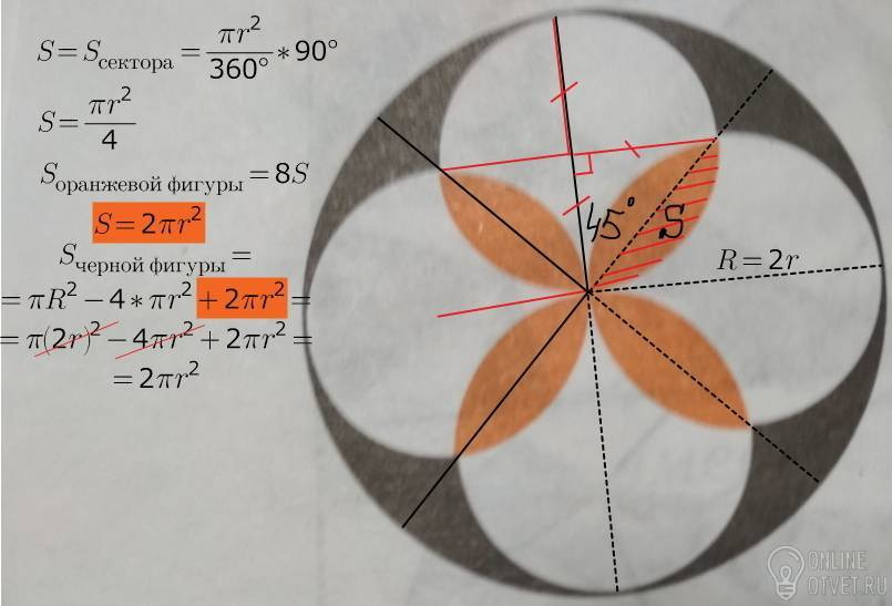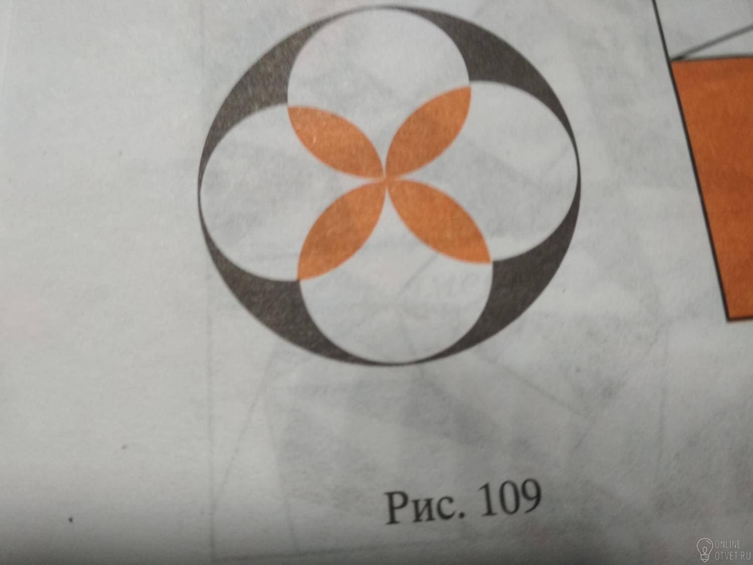 Орнамент состоит из частей,изображенных на рисунке 109.Некоторые части окрашены в оранжевый и черный цвет. Используя тот факт что если радиус одного что если радиус одного круга в два раза больше радиуса другого круга то площадь первого в 4 раза больше площади второго покажите что для окраски частей этого орнамента потребуется равное количество оранжевой и черной краски.