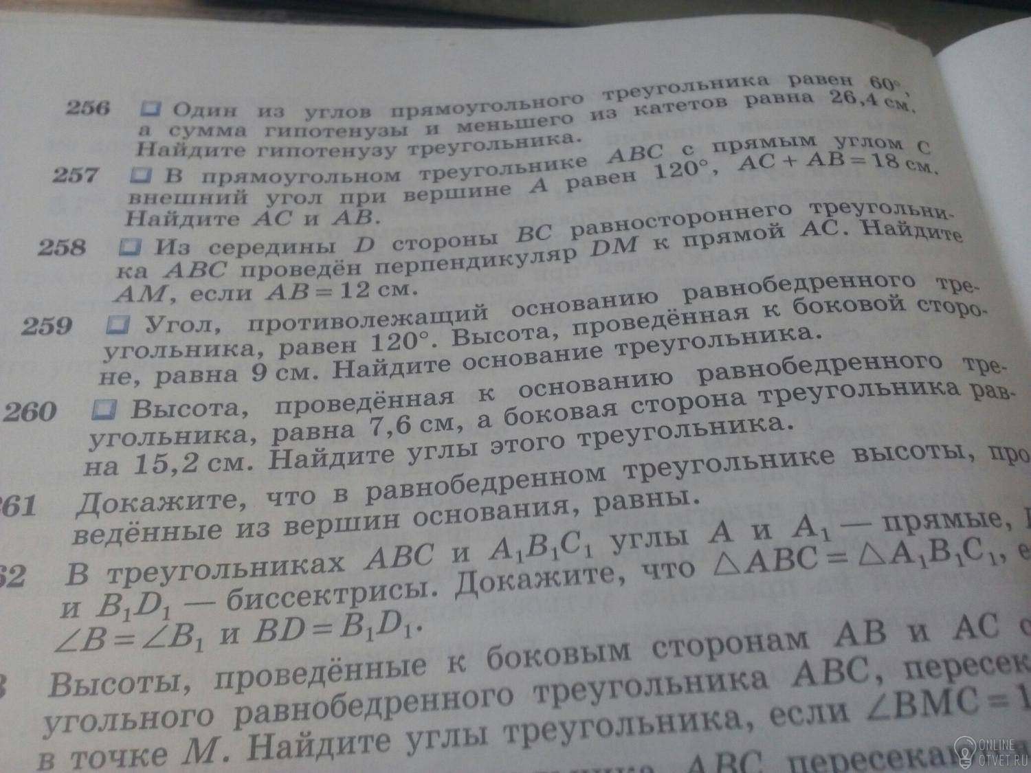 260. 15.2÷2=7.6 угол напротив катета который лежит напротив угла в 30 градусов равен половине гипотенузы.
