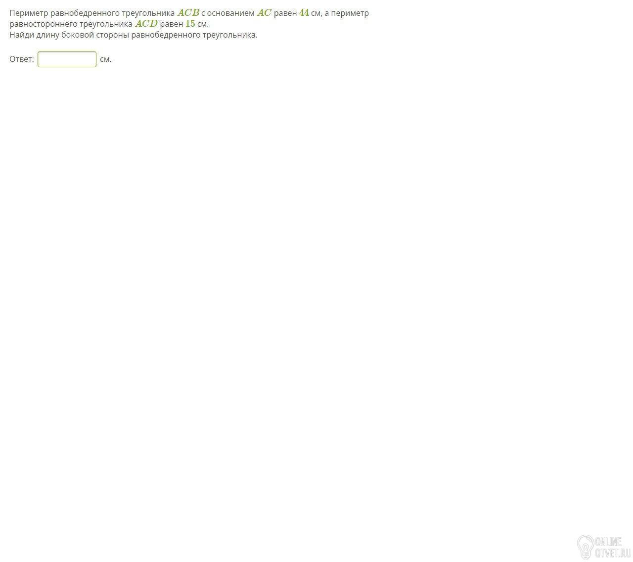 в треугольнике АСB AC=5, значит AB=BC=44-5/2=39/2=18.5см