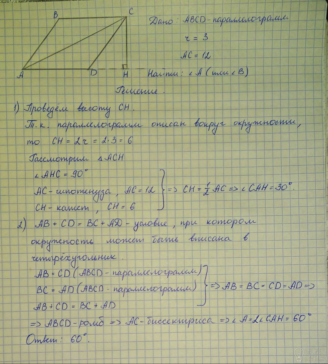 Вокруг окружности радиуса 3 описан параллелограмм, одна из диагоналейкоторого равна 12. Найдите градусную меру меньшего из углов этого параллелограмма.