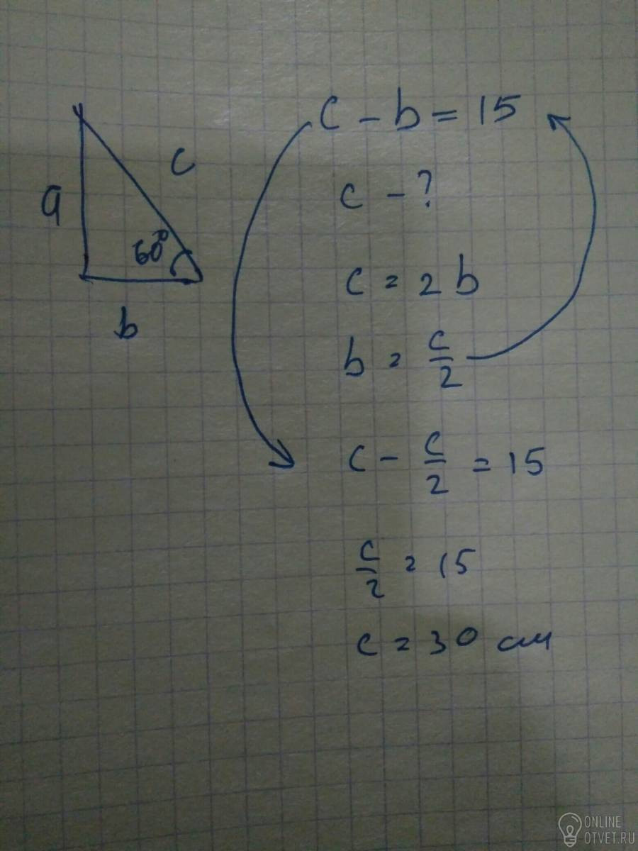 Один из углов прямоугольного треугольника равен 60 градусов, а разность гипотенузы и меньшего катета равна 15 см.Найти длину гипотенузы