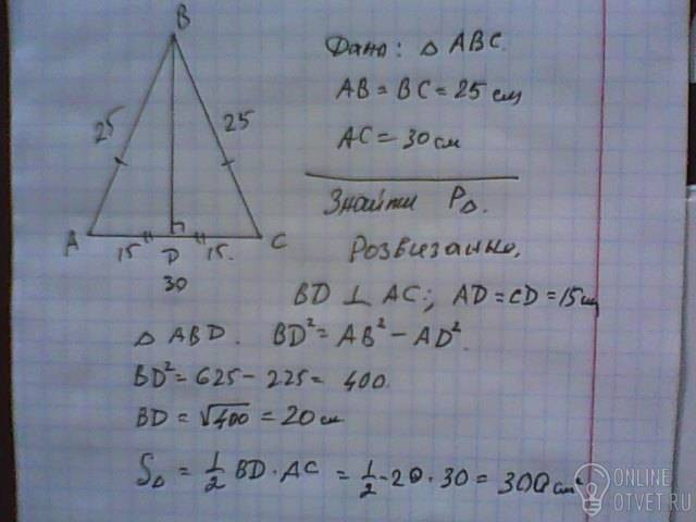 Бічна сторона рівнобедреного трикутнтка дорівнює 25 см, основа 30 см. Обчисліть площу даного трикутника.