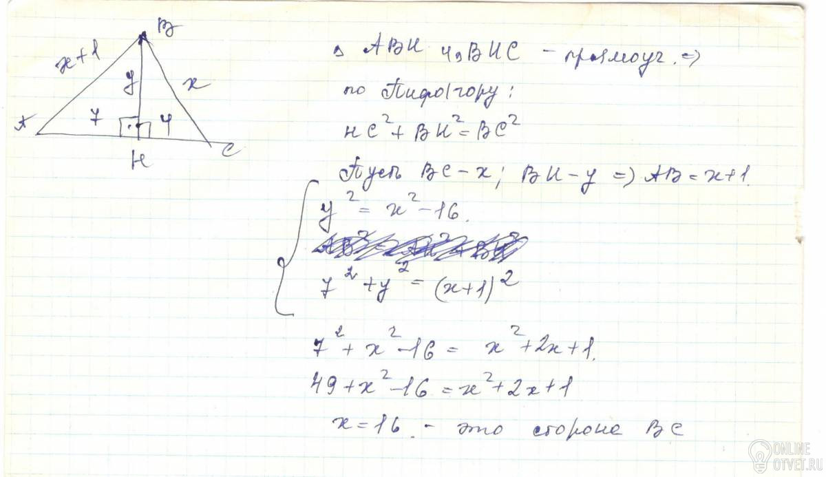 От точки к прямой проведены 2 наклонных, разница длин которых равна 1 см. найдите длину меньшей наклонной если проекции наклонных равны 4 и 7 см