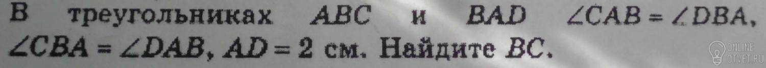 4. Значит, четырёхугольник ADBC — параллелограмм. У параллелограмма противоположные стороны равны, следовательно, BC=AD=2 см.