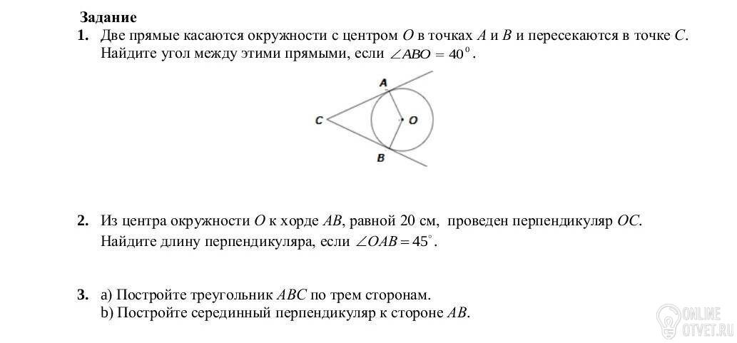 Треугольник ОАВ равнобедренный угол ОАВ=АВО=45 угол О=90 ОС - биссектриса и высота и медиана АС=ОС=1/2АВ=10 см угол ОАВ и угол АОС=45