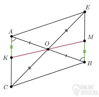 Отрезки AB и CE пересекаются в их общей середине О. На отрезках AC и BE отмечены точки К и M так, что AK равно BM. Доказать, что OK равно OM. СРОЧНО!!!!ПЛИЗЗ! 20 Б!!!!