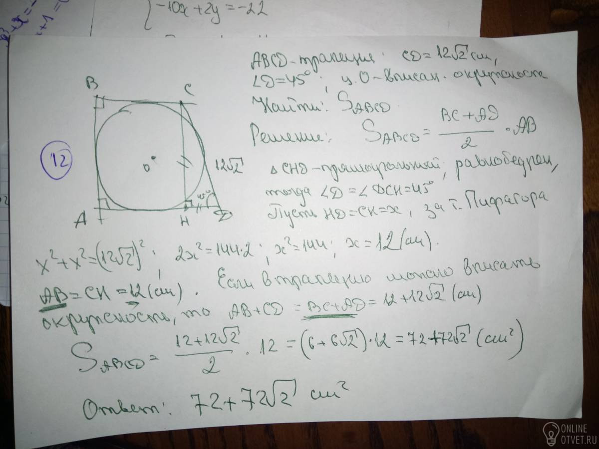 Большая боковая сторона прямоугольной трапеции равна 12√2 см, а острый угол - 45°, найдите площадь трапеции, если известно, что в трапецию можно вписать в окружность