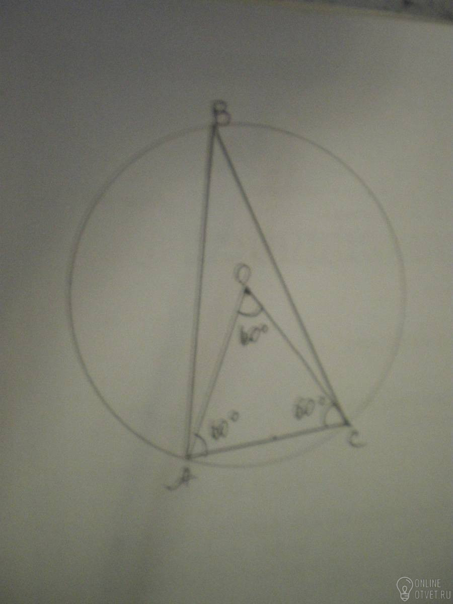 Равнобедренный треугольник ABC вписан в окружность основание треугольника AC равен радиусу окружности. Найдите велечины дуг AC,AB,BC
