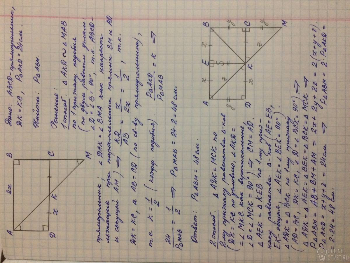 Через вершину A прямоугольника ABCD и середину стороны CD (точку K) проведена прямая. Она пересекается с прямой BC в точке M. Периметр треугольника AKD равен 24 см. Вычислите периметр треугольника ABM.