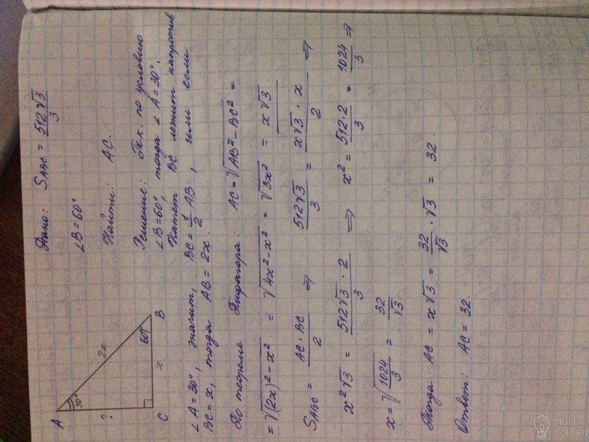 Площадь прямоугольного треугольника равна 512√3/3 Один из острых углов равен 60°. Найдите длину катета, лежащего напротив этого угла.