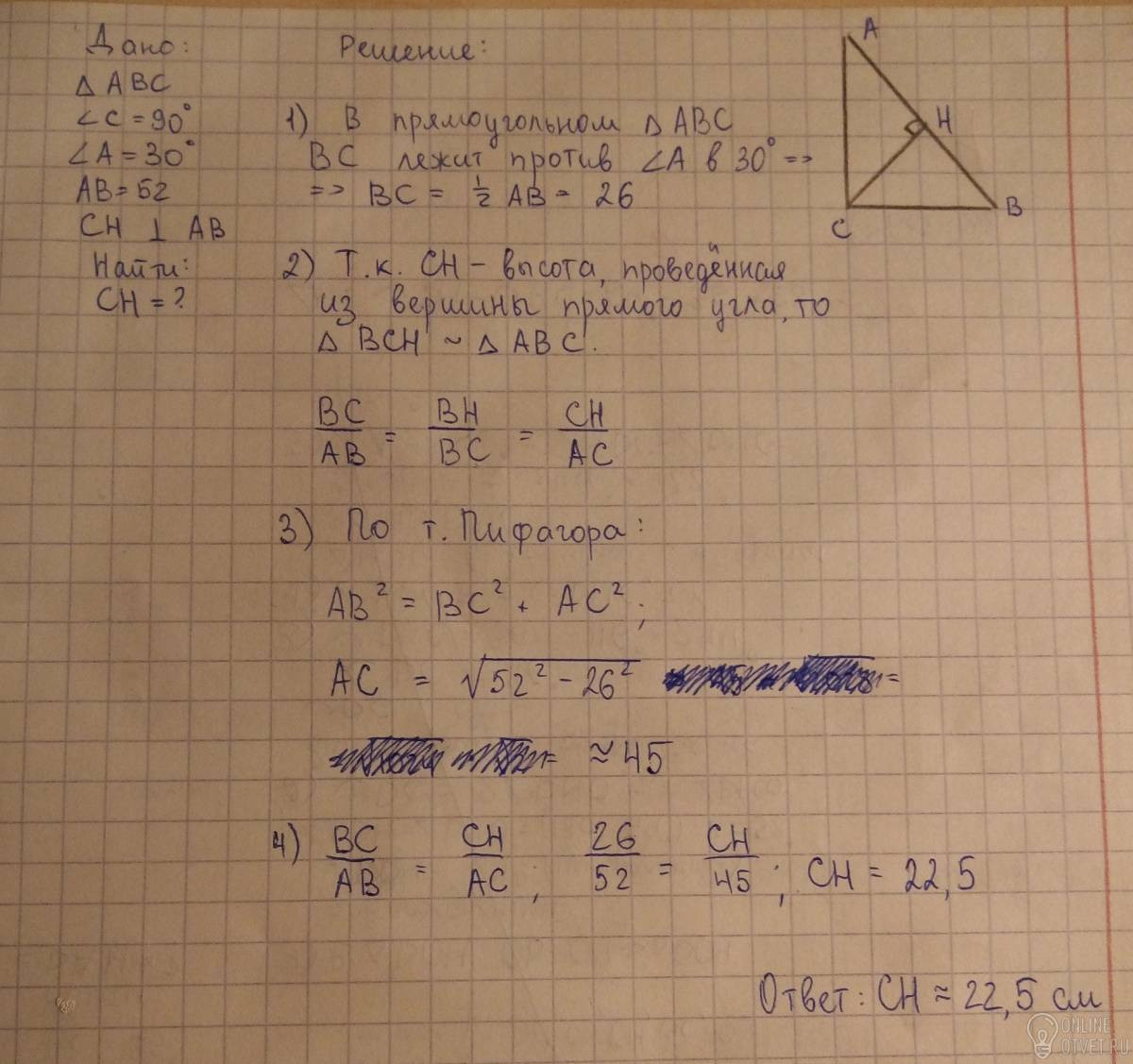 В треугольнике ABC угол C равен 90°, угол A равен 30°, AB= 52 см. Найдите высоты CH. Если можно на листочке