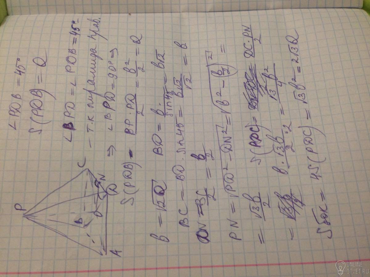 Найдите площадь боковой поверхности правильной четырехугольной пирамиды если ее боковое ребро составляет с плоскостью основания угол 45°, а площадь диагонального сечения равна Q.