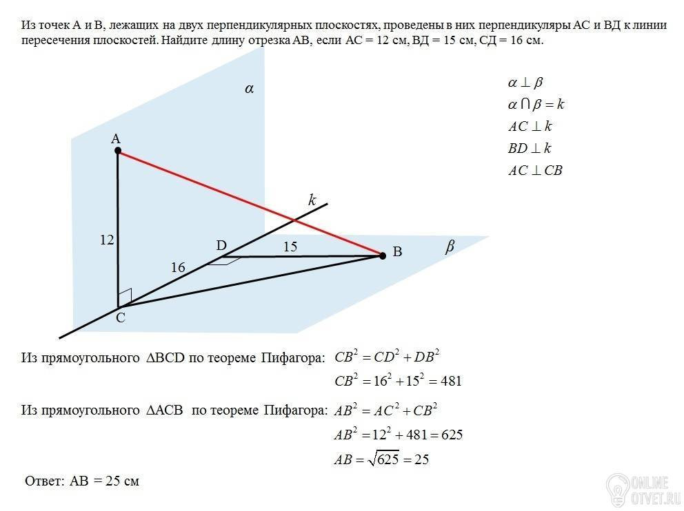 Из точек А и В, лежащих двух перпендикулярных плоскостях, проведены в них перпендикуляры АС и ВД к линии пересечения плоскостей. Найдите длину отрезка АВ, если АС=12см, ВД=15см, СД=16