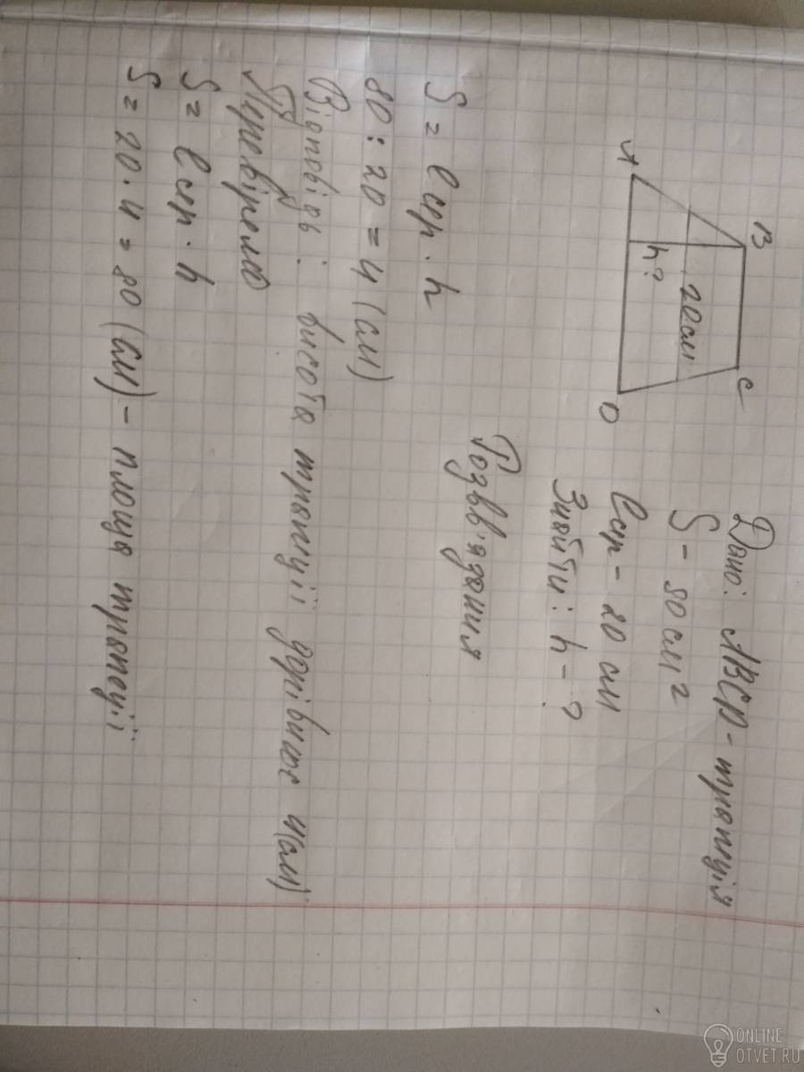 Площа трапеції дорівнює 80 см2 а її середня лінія 20 см знайдіть висоту трапеції